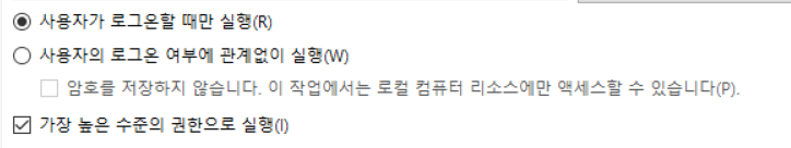 일반 탭에서는 이름에는 스케줄러 이름을 적어주고 보안에서는 가장 높은 수준의 권한으로 실행을 체크합니다.