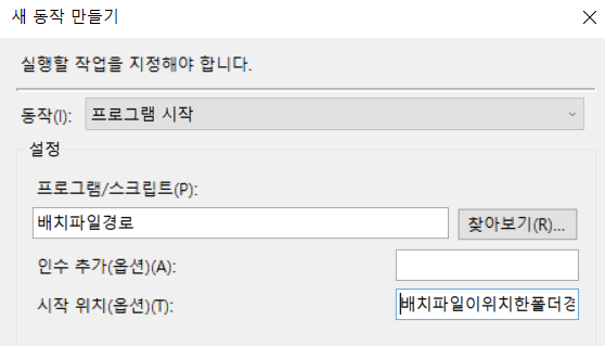 동작 탭에서는 새로 만들기를 눌러 새 동작을 만들어주는데 프로그램/스크립트에는 배치파일의 경로(배치파일이 위치한 디렉터리 경로 + \배치파일명.bat)를 써주고 시작 위치에는 배치파일이 위치한 디렉터리 경로를 써줍니다.