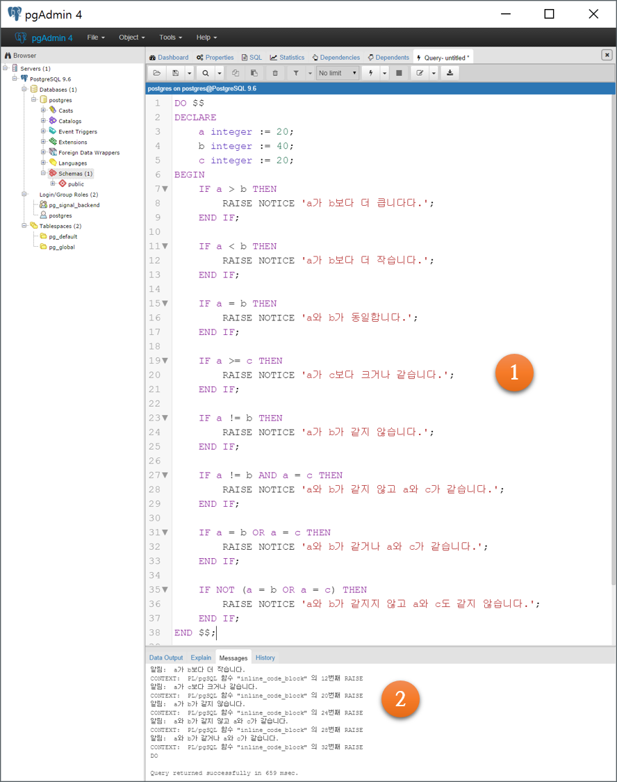RAISE NOTICE 'a가 b보다 더 큽니다.';