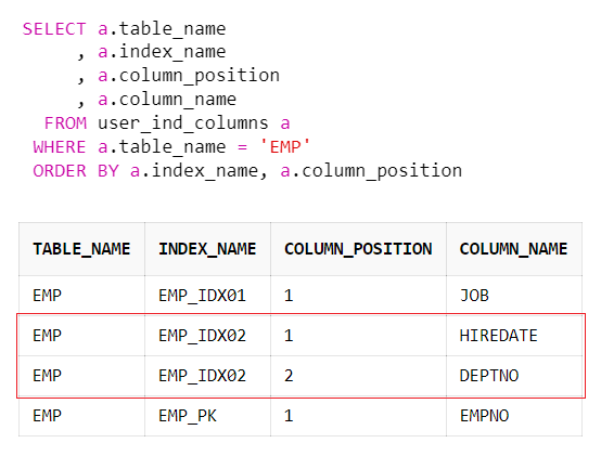 - 위 예시의 EMP 테이블의 EMP_IDX02 인덱스는 COLUMN_POSITION를 기준으로 HIREDATE, DEPNO 두 개의 칼럼으로 구성되어 있다. 인덱스는 정의된 칼럼 순서대로 정렬되어 별도 지정된 영역에 저장되어 있다. 인덱스를 사용하게 되면 테이블에 바로 접근하지 않고 인덱스 영역에서 빠르게 ROWID를 찾아낸 후 실제 테이블에서 해당하는 데이터를 찾는다.