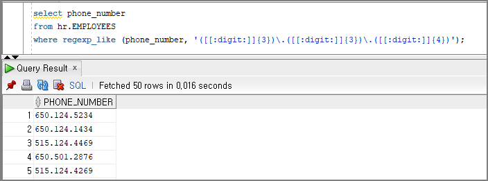 하지만, regexp_like(....) 을 이용하면 아주 간단하게 조회할 수 있습니다.